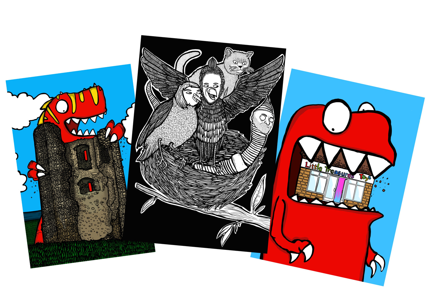 From couples having a picnic in a meadow that's about to be trampled by a huge monster, a zombie toyshop keeper hanging about with her zombie toys, historic landmarks from around the world getting grabbed, eaten and blasted with lasers to cute family portraits in front of their home surrounded by favourite toys, with a huge robot lumbering over the horizon.
